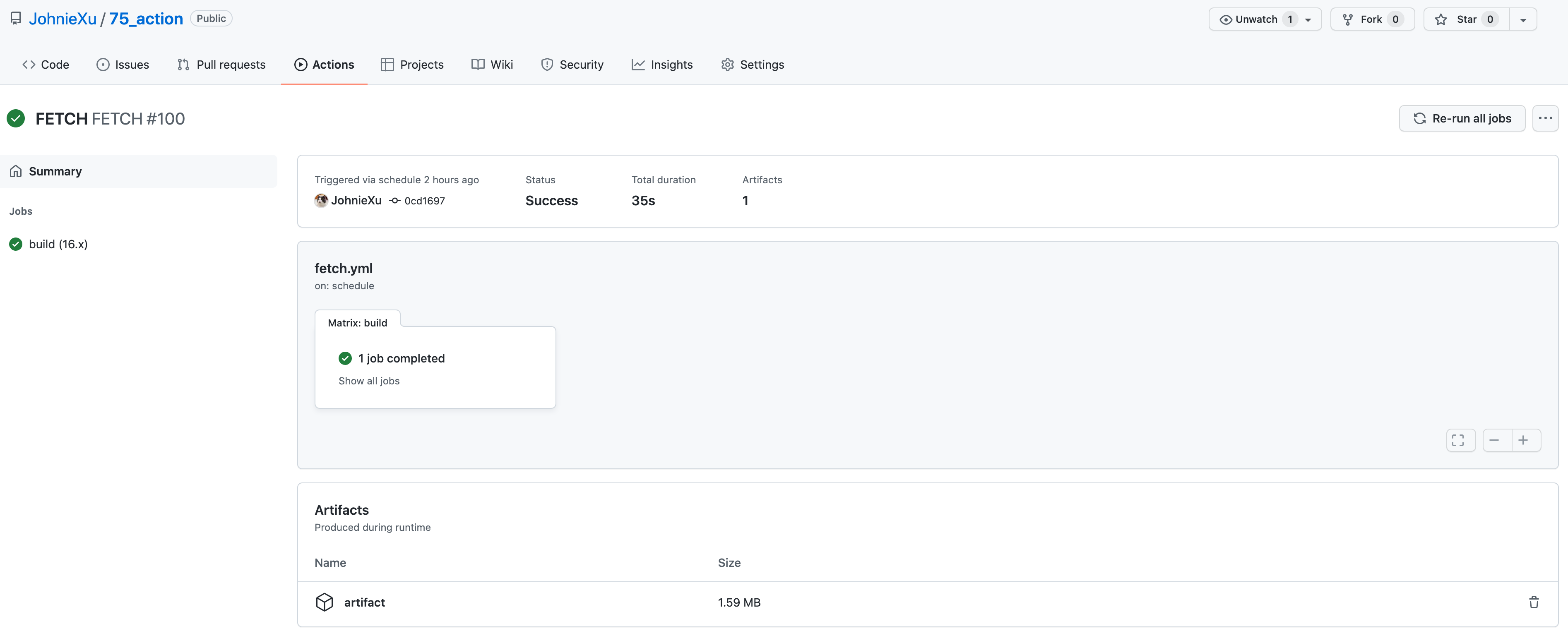 此功能使用 GitHub Actions 自动执行定时任务,在项目中添加对应的 yml 配置文件即可,对应源码在这里查看:https://github.com/JohnieXu/75_action/blob/master/.github/workflows/fetch.yml