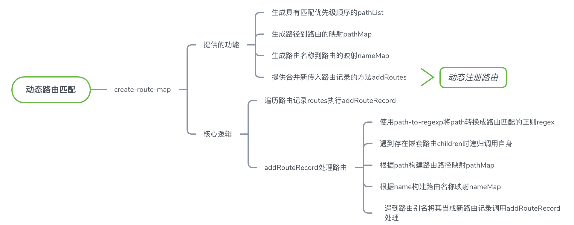 createRoute:将外部传入的路由记录转换成统一的route对象,传入组件实例的$route就是此处返回的 alias:处理路由别名 nameMap:处理命名路由 路由参数解析:解析路由location.params、query参数、hash等,动态路由匹配正是来自此处