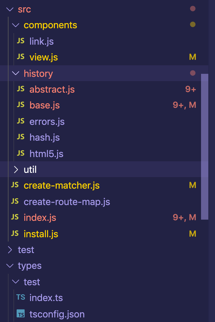 源码结构算是秉承着vue系列的一目了然的特性,主要分为组件link和view、维护路由的history、vue插件的注册方法install.js、模块导出文件index.js