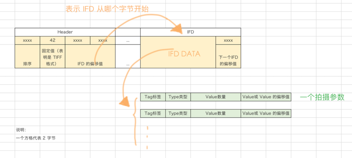 TIFF 可以理解成和 MySQL 数据库中表一样,是一条一条记录数据的,一条记录代表了一个数据体,称为:Tag。下图中黄色部分为一个 Tag 的结构,Tag 分为 Header 部分和 IFD 部分。