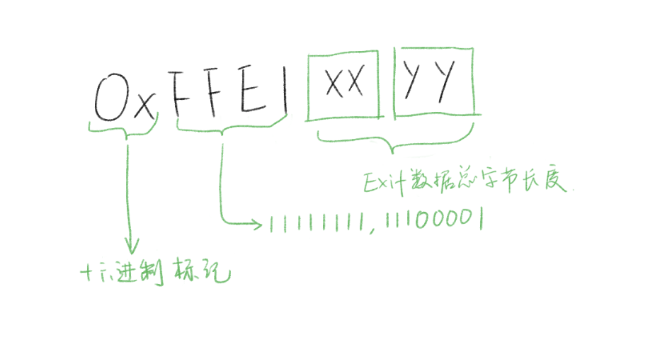 这个标记是 2 字节长的 0xFFE1,这是十六进制表示,表示的是什么意思呢?且看下文解释。