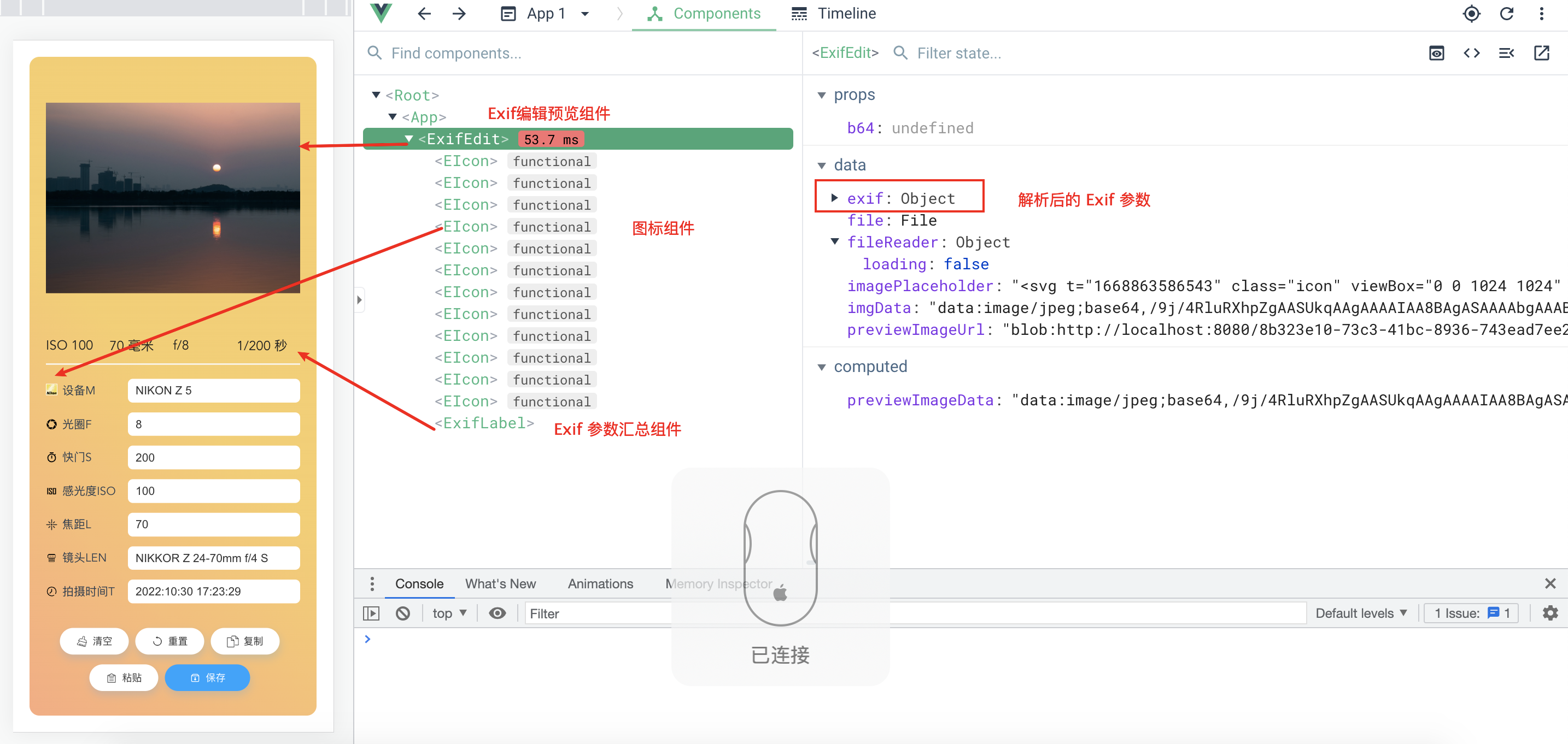 通过 ExifEdit 组件接受图片 dataURL 数据或者通过交互选择本地文件,读取为 dataURL 字符串,然后调用 piexifjs 库获取对应的 Exif 数据对象,然后解析 Exif 数据对象中的设备型号、拍摄参数等。
