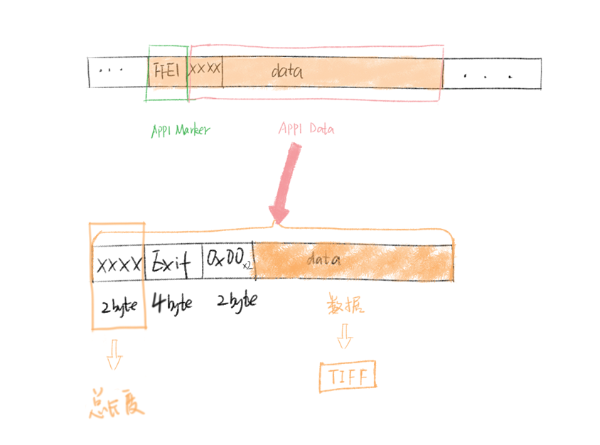 可以简要描述为:Exif 信息数据以两个字节长度的特定标记开头,这个标记之后的两个字节记录Exif数据总的字节长度。有了 Exif 标记和所有数据总字节长度,就能知道哪些是 Exif 数据了。