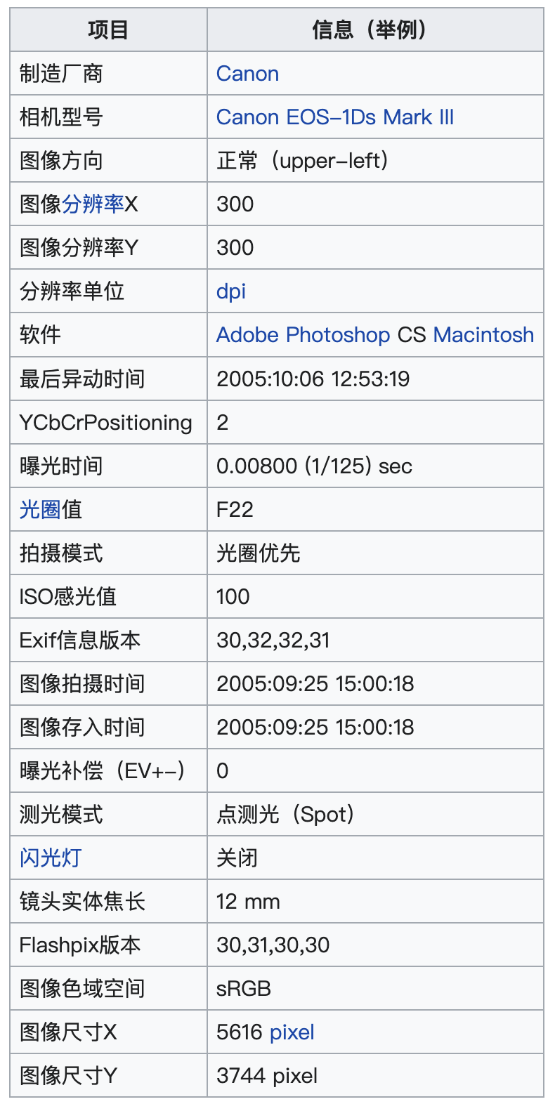 维基百科上给出的 Exif 包含的信息示例如下: