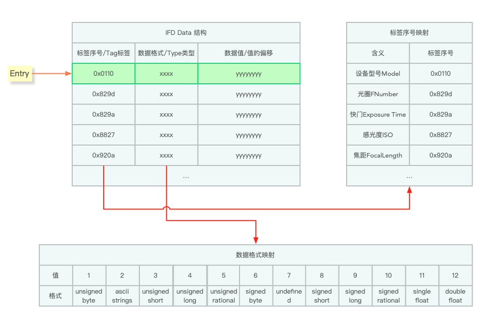 一个 Entry 展开为如下图,光圈、快门等拍摄参数根据标签序号映射向左边 IFD Data 数据中查找即可。