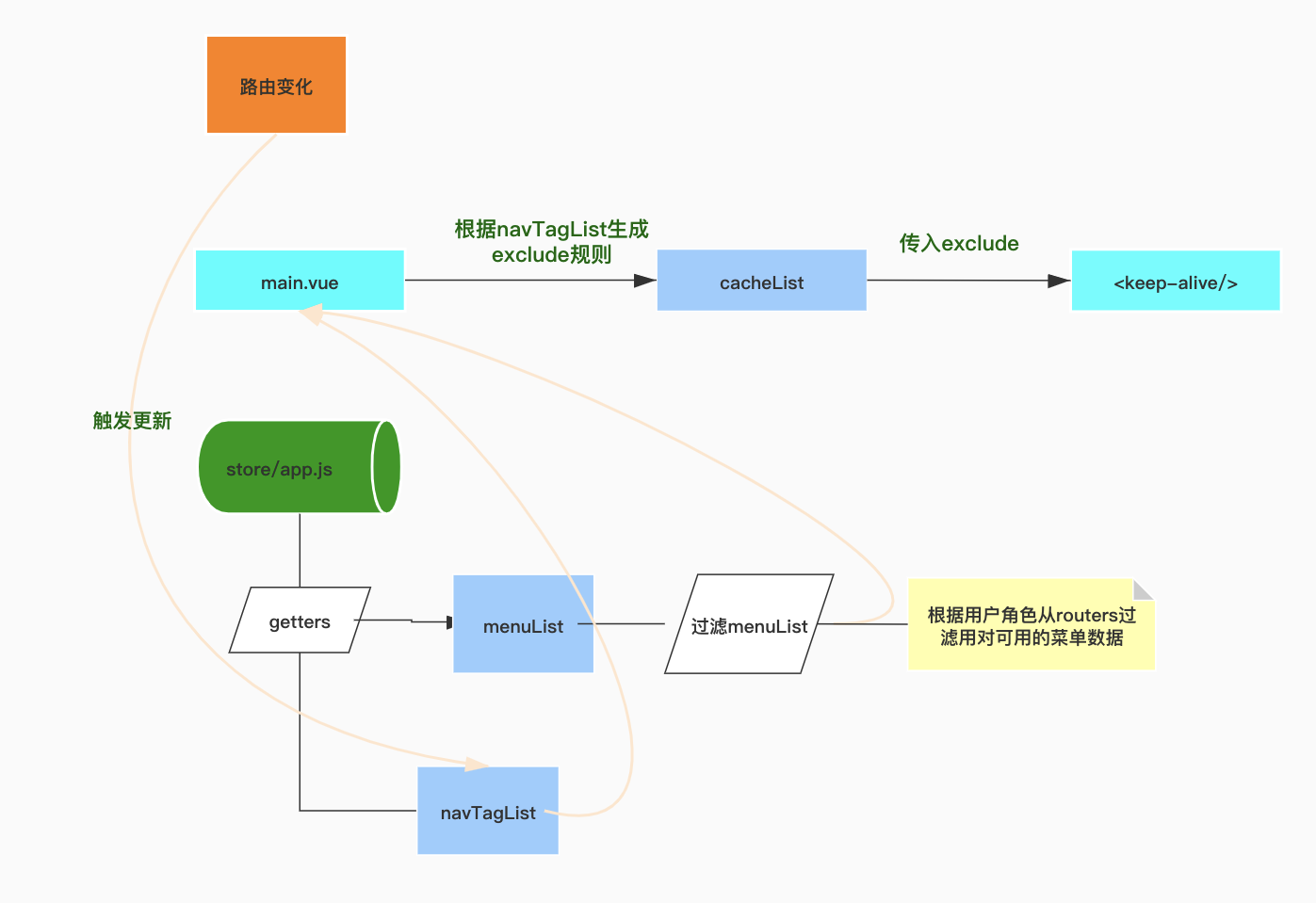 cacheList是app模块的的getters之一,用户从tagNavList中计算出当前打开的标签页需要用keep-alive缓存的组件name数组,此处采用的是动态修改keep-alive组件的exclude的值来动态更新路由的缓存规则